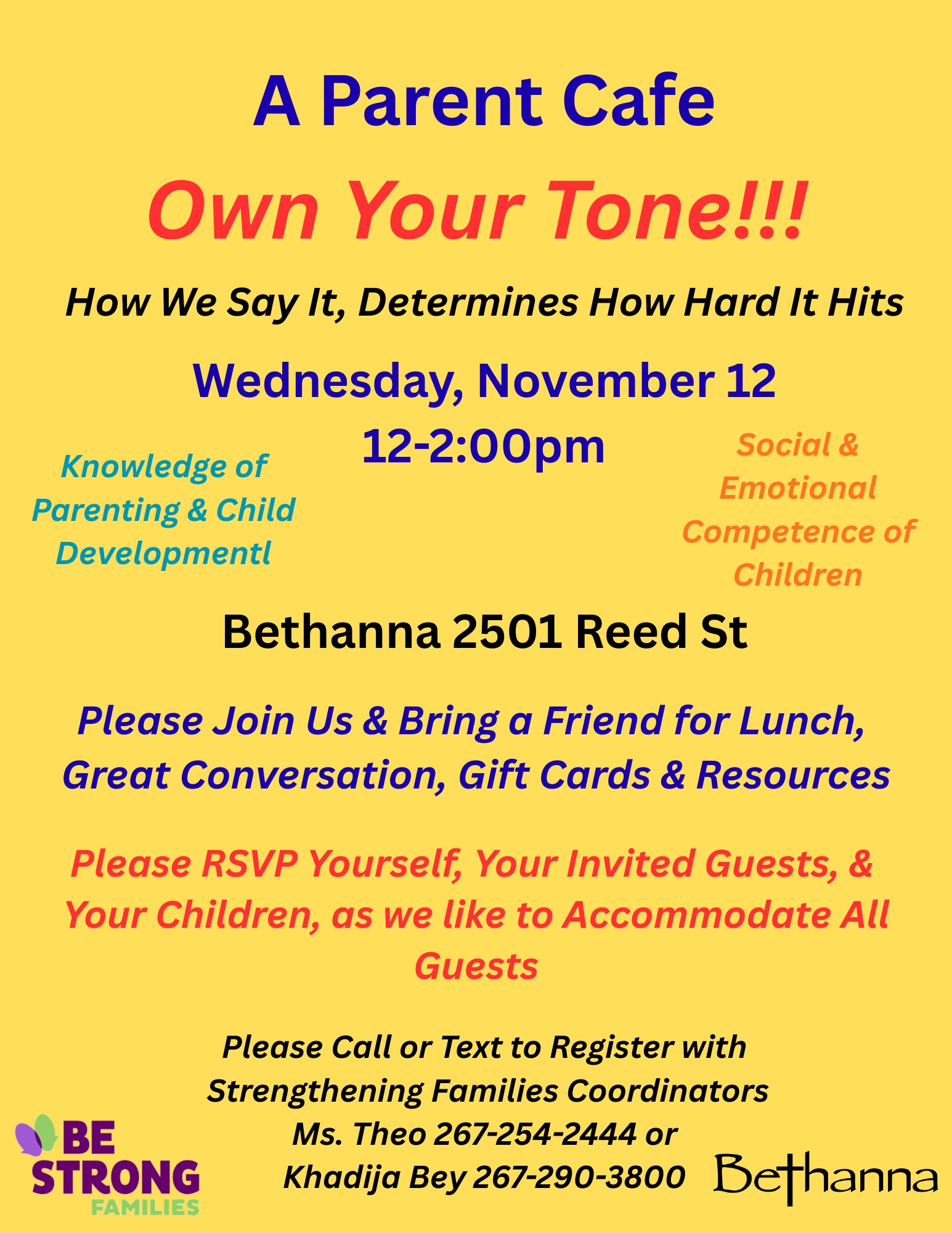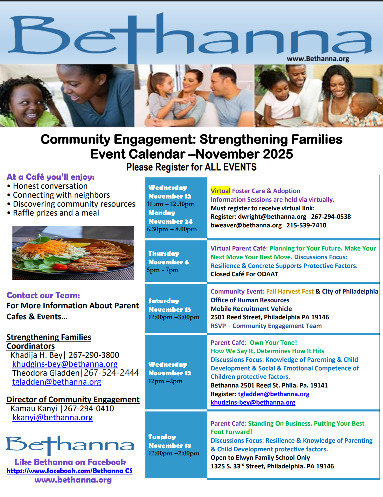Theodora Gladden, Strengthening Families Coordinator | Tel: 267-524-2444 | Email: tgladden@bethanna.org